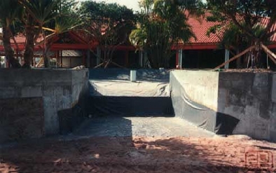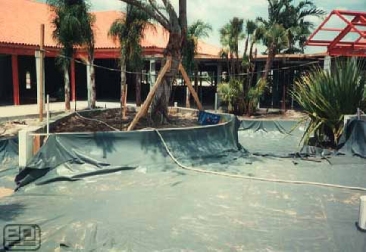 Bob Morris of Rockscapes International created this striking water feature at the Waterside Shops in Naples, Florida using EPI 30 mil PVC. 30 mil PVC panels were custom fabricated by EPI and shipped to the project site in Florida. Shot Crete was placed over the PVC geomembrane to create the free form water feature's containment.