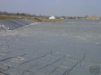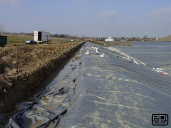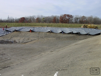 30 mil PVC geomembrane, custom fabricated and installed by EPI. The choice of geomembrane material for the landfill liner was logical. PVC, in prefabricated panels allowed the entire 6 acre site to be lined in few working days. Construction managers at Blasland Bouck & Lee in Ann Arbor contacted EPI for assistance with providing the geosynthetics for this project. The geosynthetic portion of the project had a late season start, so installation and welding would have to be done in less than ideal weather conditions. EPI has the ability to fabricate panels as large as 20,000 square feet with all of the panel fabrication welding done in the factory under controlled conditions. Using AutoCADD, EPI designed a panel layout that minimized waste and scrap in this irregularly shaped cell. The PVC panels were then fabricated at EPI's plant to the required dimensions and shapes per this custom panel layout. With these prefabricated panels, field seams were reduced by 70% over the amount required for polyethylene rolls. And, because there were fewer field seams, installation was faster and overall labor costs were lower.